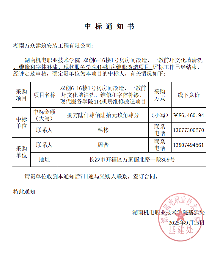 双创6-16楼1号房房间改造、一教前坪文化墙清洗、维修和字体补漆、现代服务学院414机房维修改造项目中标通知书