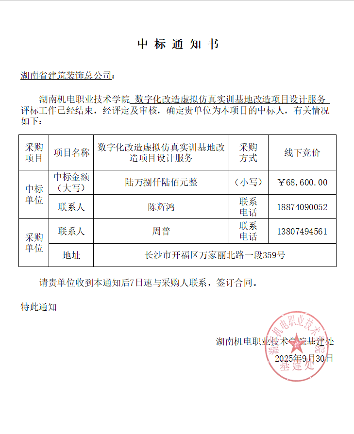 数字化改造虚拟仿真实训基地改造项目设计服务中标通知书