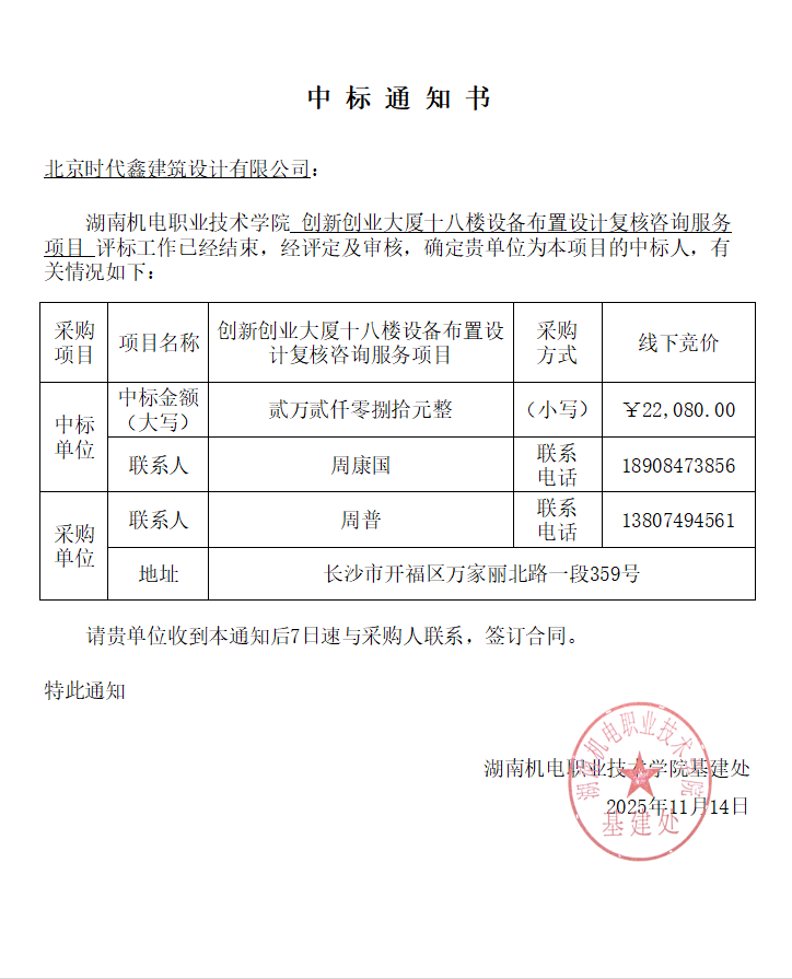 创新创业大厦十八楼设备布置设计复核咨询服务项目设计服务中标通知书
