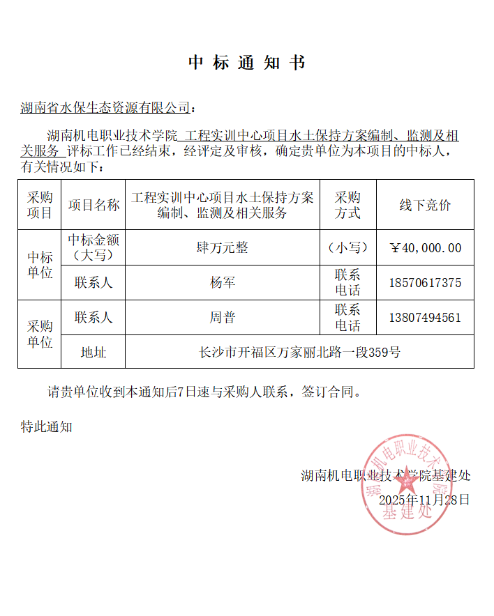 工程实训中心项目水土保持方案编制、监测及相关服务中标通知书