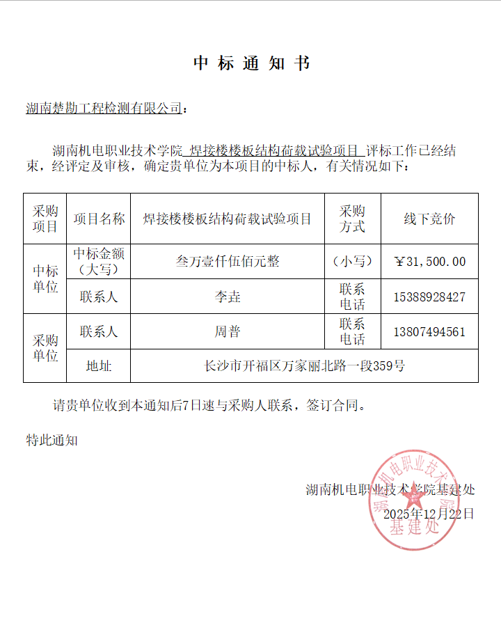 焊接楼楼板结构荷载试验项目中标通知书