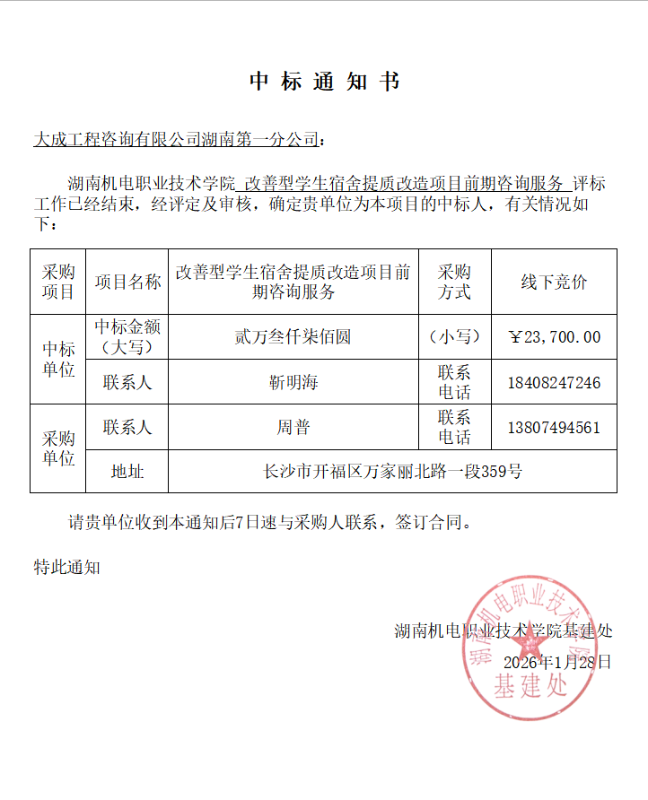 改善型学生宿舍提质改造项目前期咨询服务中标通知书