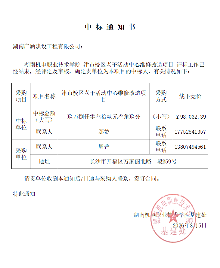 津市校区老干活动中心维修改造项目中标通知书