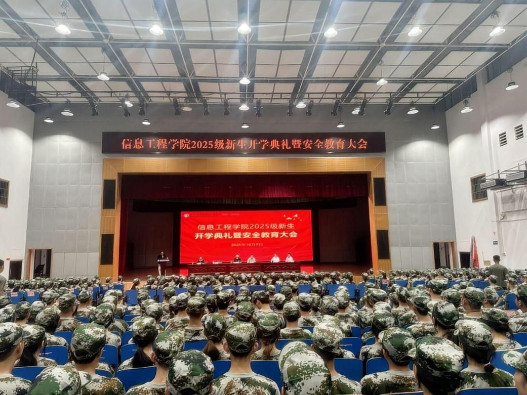 10月9日,我校信息工程学院举行2025级新生开学典礼暨安全教育大会。信息工程学院党总支书记潘鑫、院长冉成科、副院长廖坚,应用电子与软件技术教研室主任吴良圆、人工智能教研室主任仲柏同出席大会,信息工程学院党总支副书记阮坚主持大会。