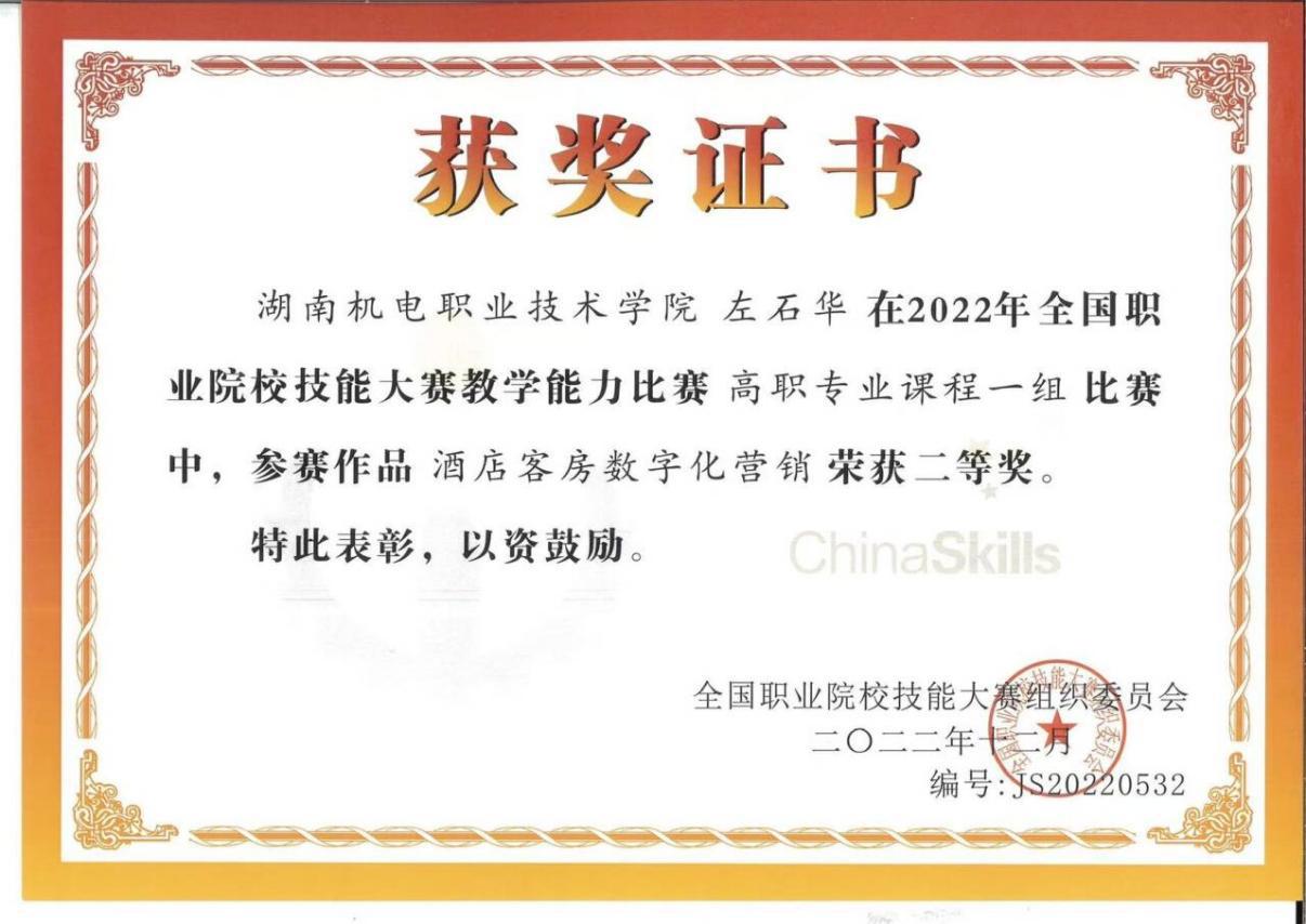 2022 年,左石华老师在全国职业院校技能大赛教学能力比赛高职专业课程一组中,凭借参赛作品《酒店客房数字化营销》荣获二等奖;