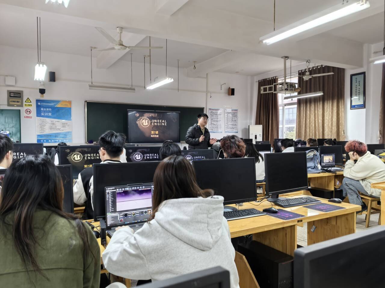 11 月 17 日下午,数字媒体专业王振宇老师带来《虚拟现实应用设计》“地形构建”公开课。课程采用理实一体化模式,覆盖 UE4 新建地图、地形雕刻工具使用、灰度图导入全流程,重点讲解雕刻、平滑、侵蚀等工具的组合运用,以及灰度图预处理与 UE4 导入参数的匹配技巧。课上还以《黑神话:悟空》为思政案例,引导学生在地形雕刻中融入中国传统文化元素,培养数字场景创作的文化自信。