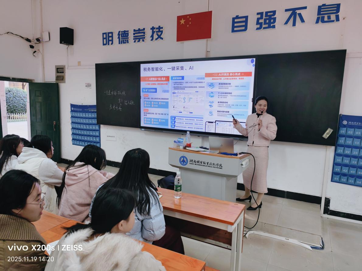 湖南和合财税服务集团有限公司总经理郑夕容以“绘制你的财务人生——未来路径与核心能力”为主题,围绕大数据与会计专业的人才培养需求展开讲座。她从金税四期改革与税务智能化发展趋势入手,指出传统“账房先生”式的角色已无法适应行业变革,现代会计人才必须兼具扎实的财务功底与数字化应用能力。结合个人从出纳到企业管理者的成长经历,郑夕容系统剖析了企业财务、咨询机构、体制内岗位以及自主创业四条职业发展路径,强调应树立“以终为始”的规划意识。她还建议学生尽早考取初级会计职称、注册税务师等职业证书,并熟练掌握Excel、Python等数据处理工具,为未来职业发展奠定坚实基础。