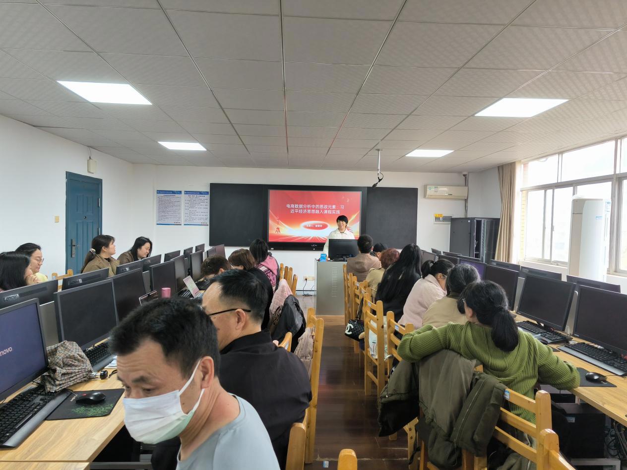 活动中,彭荣华副教授以“电商数据分析中的思政元素:习近平经济思想融入课程实践” 为主题,从习近平经济思想的基本内容、丰富发展、课程实践融入路径及注意事项四个维度展开系统讲解。结合电商数据分析专业课程八大项目内容,彭荣华副教授将习近平经济思想与专业教学精准对接、深度融合,逐一挖掘课程中的思政元素。她明确课程融入的核心要求,需结合电商数据分析专业实际,避免空洞说教,紧扣要点,让思政教育真正融入专业教学各环节。
