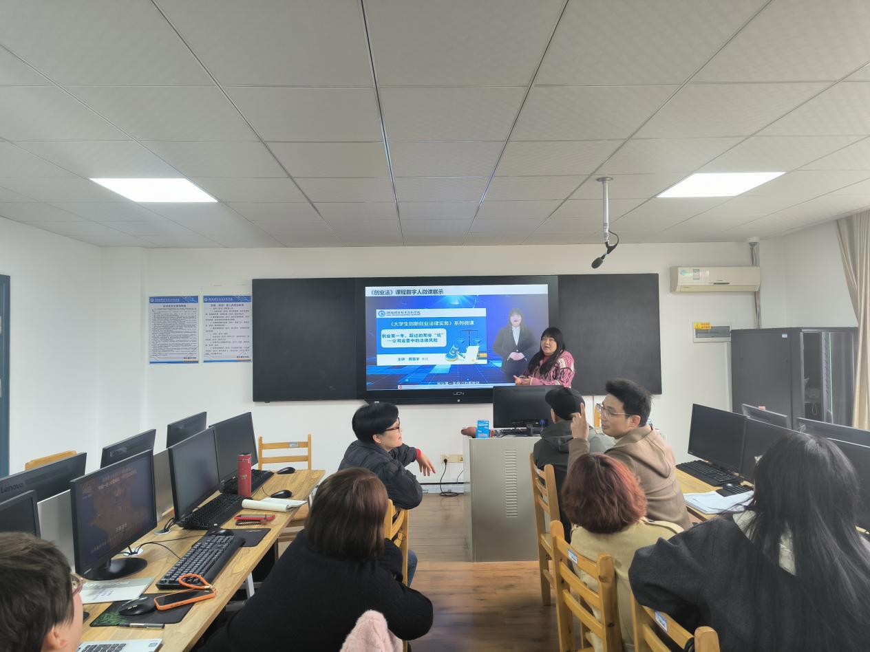 在理论讲解之后,黄亚宇教授结合教研室专业教学实际,重点展示了《大学生创新创业法律实务》课程的数字人微课成果。此次展示的数字人微课,紧扣创新创业法律教学中的重难点内容,以数字人为主讲主体,通过清晰的语言表达、直观的画面呈现,将创业法相关法律条文、案例分析等内容生动演绎,让原本枯燥的法律知识变得通俗易懂。微课中,数字人不仅能完成知识点的标准化讲解,还能通过场景化呈现,帮助学生更好地理解法律知识在创新创业实践中的应用,充分展现了数字人技术在课程教学中的独特优势。