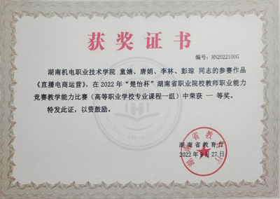 2024年度“楚怡杯”湖南省职业院校技能竞赛《电商技能》赛项获一等奖;