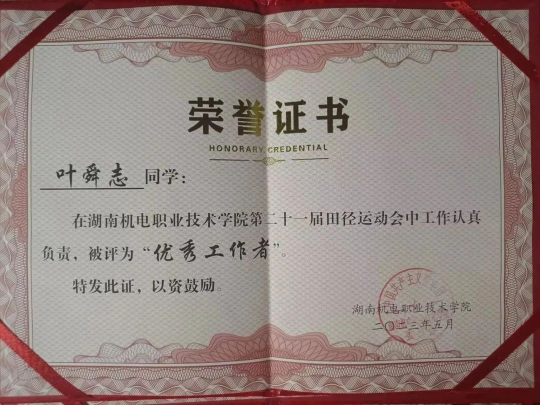 在湖南机电职业技术学院第二十一届田径运动会中被评为“优秀工作者”