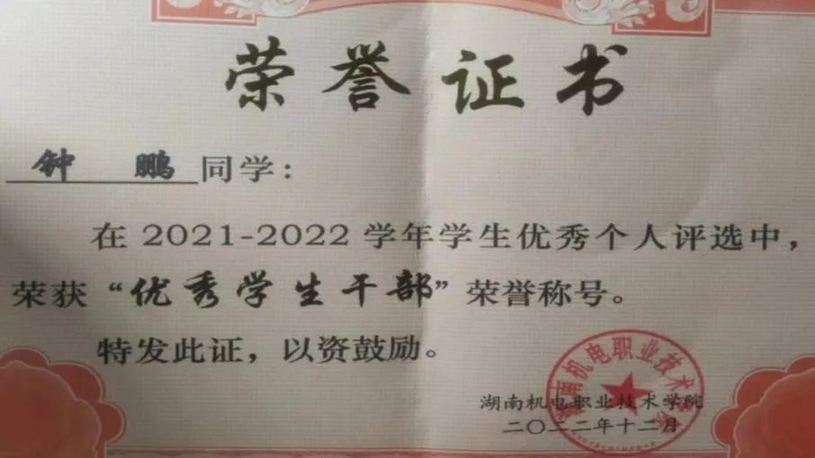 3、荣获“2021-2022年度优秀学生干部”荣誉称号