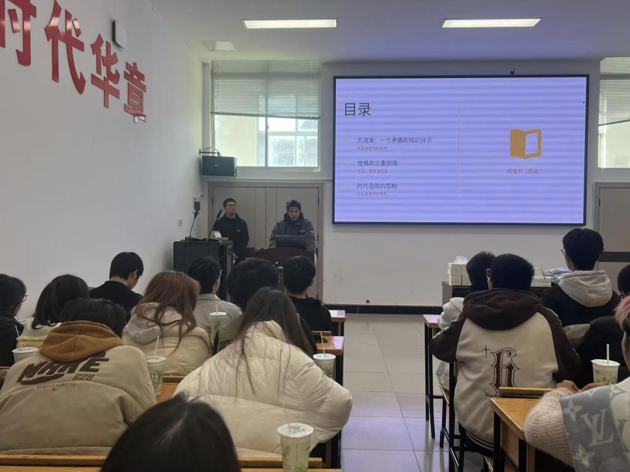 读书分享环节,六位领读同学依次登台,围绕着《围城》和《平凡的世界》两本经典作品,来分享阅读心得与个人见解 ,王倩,邱元甲,李志三位同学是围绕《平凡的世界》 ,谭刘娟,黄振,田佳慧三位同学是围绕是《围城》。王倩同学率先开场,以孙少安办砖厂的韧劲,对照当代青年的生活压力;邱元甲同学借孙少平的“远方执念”,聊平凡生活里的精神追求; 谭刘娟同学用方鸿渐的职场困境,对应“躺平vs内卷”的当代焦虑;黄振同学从方鸿渐的情感选择,谈年轻人的婚恋纠结;李志同学以孙氏兄弟的不同选择,解读“平凡不是平庸”; 田佳慧同学深挖“围城”隐喻,提问当代人是否愿打破生活困局。